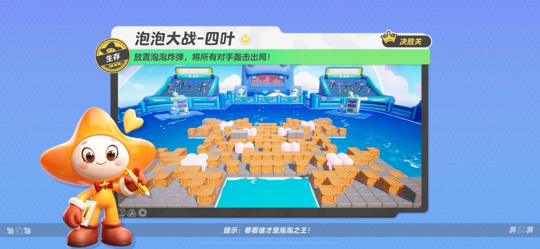 在梦幻的泡泡中躲避冲击,战到最后就是赢家! 今天星妹给大家带来的地图是【泡泡大战】玩法中的【铁拳】。在这张地图里星宝们需要在不断收缩的狭窄平台上放置泡泡轰炸对手,躲避对手的泡泡轰炸及地面上的铁拳机关,坚持站到最后就能获得胜利。 刺激的生存战中,加上铁拳机关加码,想想都很有挑战!接下来,就和星妹一起看看有哪些制胜小技巧叭(✪ω✪) 进入游戏星宝们要先面对层层木箱,放置泡泡就可以炸开阻碍啦!炸开的箱