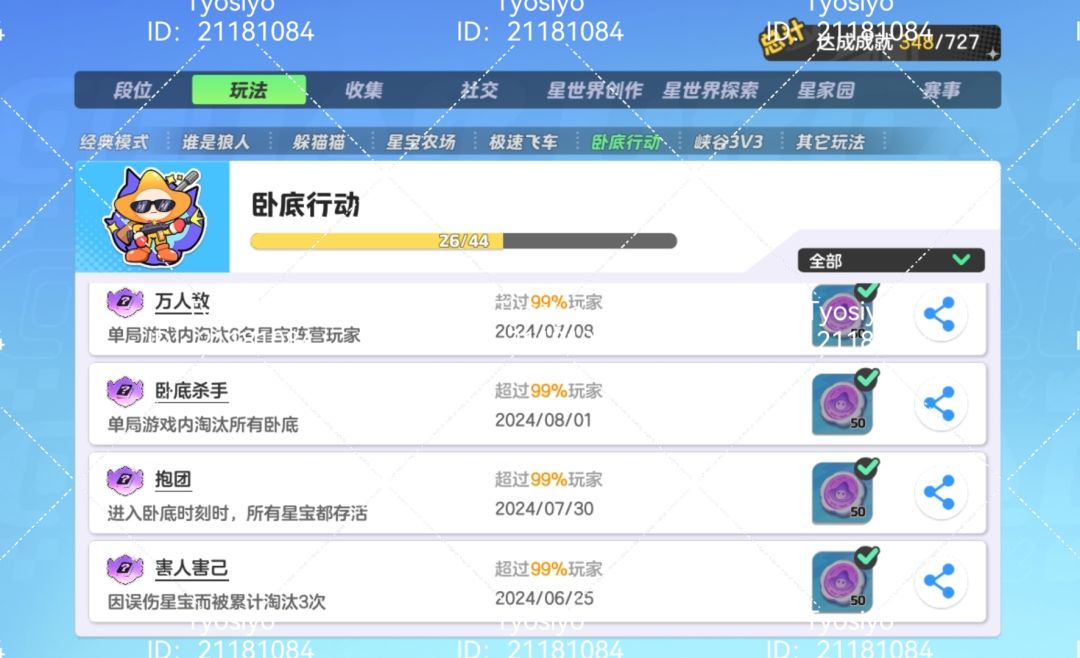 成就党看过来[表情_看我的] 截至目前 卧底行动共4个隐藏成就(不知后面还会不会更新更多~) ✅害人害己:因误伤星宝而被累计淘汰3次 ✅万人敌:单局游戏内淘汰6名星宝阵营玩家 ✅抱团:进入卧底时刻时所有星宝都存活 ✅卧底杀手:单局游戏内淘汰所有卧底 总的来讲,【抱团】可能是最难完成的,运气占很大成分,需要卧底比较菜,星宝跑得快[表情_吃瓜] 快去解锁成就叭[表情_吃瓜]#元梦之星 #游戏日常 #隐