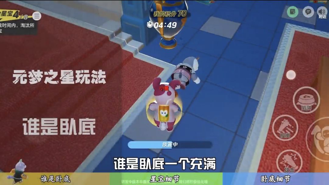 简单一点。 卧底:会隐藏,跟到人,一击必杀就好,不要落空。 星宝:不要随便靠近别人,保持距离,观察,拿分。 警卫星宝:观察,吃分,不要随便出手,不要以为有武器就无敌了,打到星宝也是好笑,尽量隐藏身份。 道具:加速,香蕉皮,番茄都挺有用的拿一个放手上。 陷阱:布置在一些过道什么的,门口,就很好。#元梦之星#攻略#是小草神捏