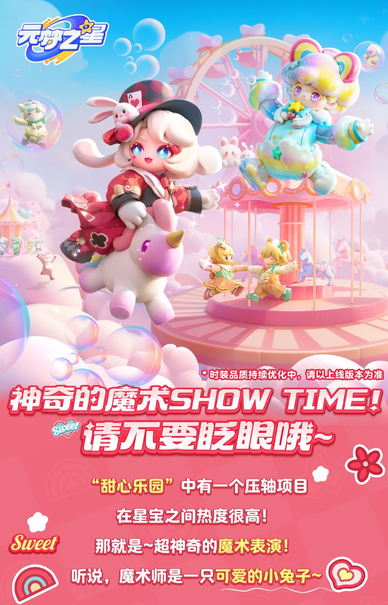 甜心乐园新赛季已经开启啦!经典模式新增8大甜心乐园主题关,极品飞车、躲猫猫、泡泡大战齐上新,超多玩法更新,快随星妹一起体验吧~ 新增4个超甜主题竞速关卡,误入多巴胺糖果色乐园,在失重的森林中蹦跳向前~ 3个新赛季主题生存关卡,驾驶彩虹小飞马与爱心箭矢和气球斗智斗勇,在甜蜜决斗场上生存到最后! 1个全新玩法的积分关卡,拾取场地中散落的颜料,为失色的旋转木马重新涂刷! 联动套娃,星妹的DNA要打结啦!