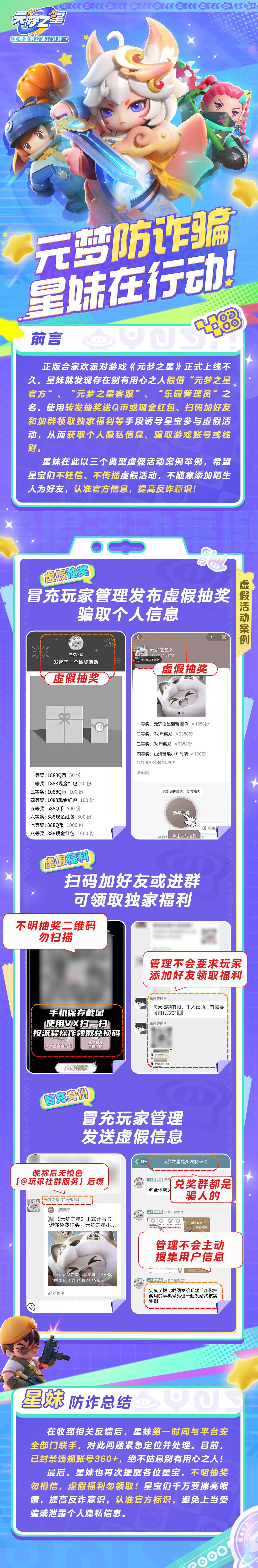 请星宝们一定要擦亮眼睛注意甄别,所有平台都需认准有官方认证的账号,切勿轻信非官方账号发布的信息。不要轻易扫码加陌生人为好友或扫码进群!官方不会索要你的账号密码及各种验证码,请多多警惕要求你提供任何个人信息及手机号的场景。 元梦防诈骗,星妹在行动!星妹情报站特发布三个典型虚假活动案例举例,多一人观看,少一人受骗!星宝们速来围观~
