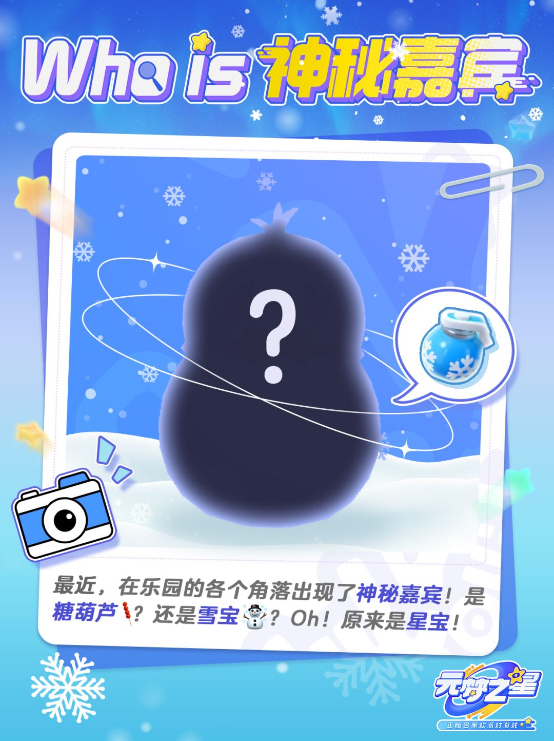 乐园的神秘嘉宾出现!(。・ω・。) 原来是变身雪人的星宝呀!⛄ 使用乐园新道具【雪人炸弹】,交雪人星朋友! 快跟上星妹的步伐,一起探寻乐园最in的玩法吧~😊