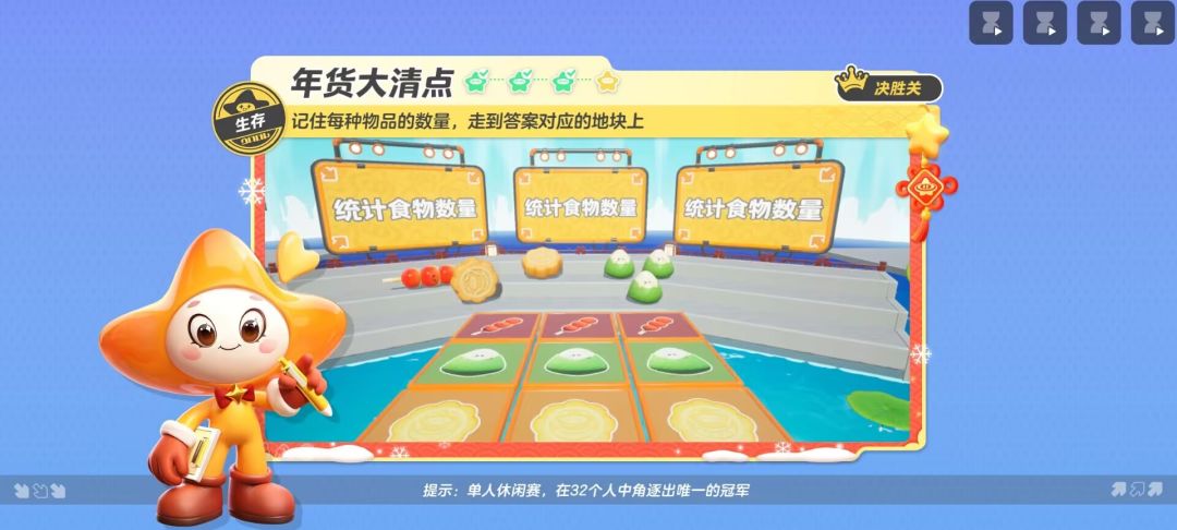 为了庆祝新年,各种各样的年货可是必不可少的!这次的新关卡【年货大清点】就给了星宝做“小当家”,参加年货清点的好机会~ 不过,如果对各种年货的数量不够了如指掌,不能及时走到正确答案的地板上,可是会掉下水面的!所以,星宝们要发挥超强的记忆力,同时要有迅速的动作和灵活的操作~ 说起来简单做起来难,事不宜迟,快和星妹一起来看看生存图【年货大清点】的攻略吧! 比赛开始前,先来看看地图!(。・∀・)ノ 整个地