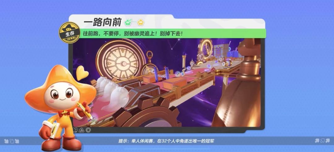 跟着时光漫游,在时光裂缝里一路向前吧! 新赛季登场上线了不少新地图,生存关卡也有了更多新奇有趣的地图升级。今天星妹就要给大家带来生存图【一路向前】的地图攻略,星宝该如何在身后有幽灵追赶的情况下获得胜利呢?快来一起康康叭~ 在【一路向前】地图中,星宝来到时光裂缝中,四周是梦幻的紫色时光虚空,被幽灵追赶上或是掉下赛道都会被淘汰出局。星宝需要一路向前,越过高低起伏的魔法块和电磁球等障碍,成功躲避身后的