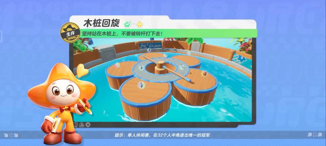 考验星宝身手的时刻到啦,面对危机四伏的木桩机关,你能全身而退吗? 在【木桩回旋】关卡里,星宝们既要提防他人的袭击,又要灵活躲避机关陷阱,从而夺得最后的胜利,可谓是相当惊险刺激呢~ 今天就让我们一起探索【木桩回旋】地图是怎么玩的吧~ 【木桩回旋】是一张生存地图。这张地图是由5个木桩和1个转杆构成。五个木桩围在窄道周围,整体看起来就像花瓣一样,木桩中间设置了一根不断旋转的转杆。 如果想要顺利拿下这一关