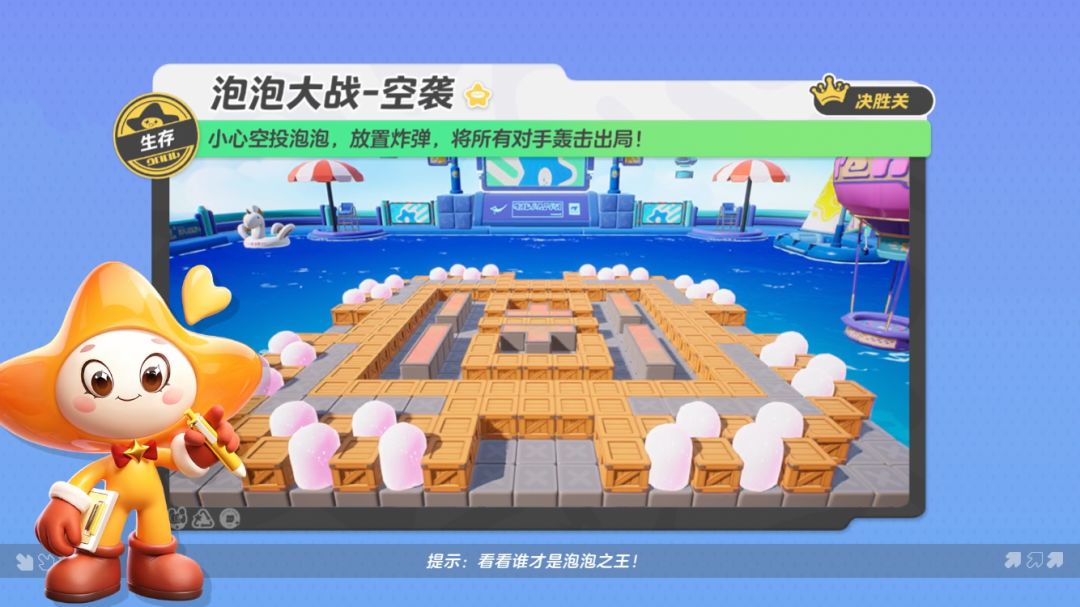排位赛和休闲赛里一直很受星宝们欢迎的生存决胜关泡泡大战,现在出了独立的娱乐模式哦! 星妹火速给大家准备了泡泡大战的攻略技巧,今天带来的是其中的【泡泡大战-空袭】地图~ 是不是有星宝还不太清楚泡泡大战的玩法机制呀?没关系,星妹先带大家一起温习一下~ 泡泡大战模式中,每局共有七名星宝参与比赛。星宝们需要在不断缩小的海上平台比拼,通过放置泡泡炸弹的方式来攻击对手,每名星宝的血条有三格,每次受击会掉一格