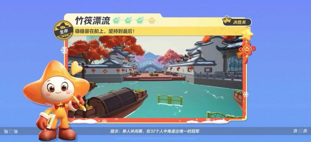 竹筏之上,漂流之行,表面看似宁静悠然,实则危机四伏,在这机关重重的水面上,究竟谁能够稳稳站在竹筏上,笑到最后呢? 今天星妹要给大家介绍的是一张生存图【竹筏漂流】。在这张地图上,需要在规定时间内,灵活躲避各类障碍,站到最后不掉落水中,才可取得游戏胜利。 星宝们想要在这场漂流中脱颖而出吗?那就快来和星妹取经吧~(*╹▽╹*) 游戏一开始,环顾四周 ,有两只竹筏并驾齐驱。星宝们随机出生在这两只竹筏上