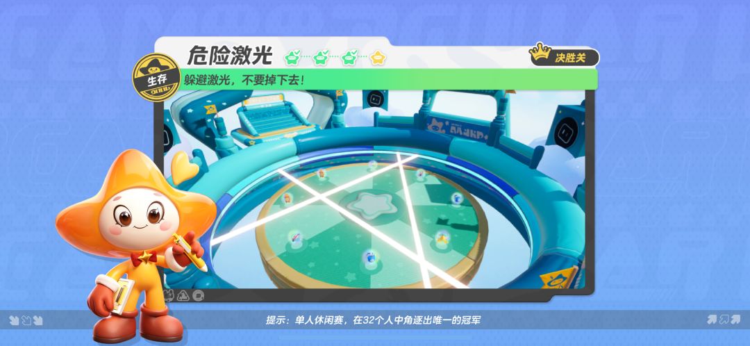 激光大舞台,有胆你就来!【危险激光】是一张生存地图。随着道道激光的逼近,星宝们的处境越来越危险,一不小心就有可能被激光拦截扫落圆台,导致游戏失败!而活到最后的关键除了避开激光扫射外,就在于巧妙使用道具啦! 游戏倒计时结束后,圆台侧面会缓慢发射出一道激光,碰到激光的星宝会被弹开。如果附近空间不足,则可能被扫出舞台,星宝们需要看准时机,并使用跳跃来躲避激光哦~ 随着时间推移,激光条数会逐渐增加到两条。