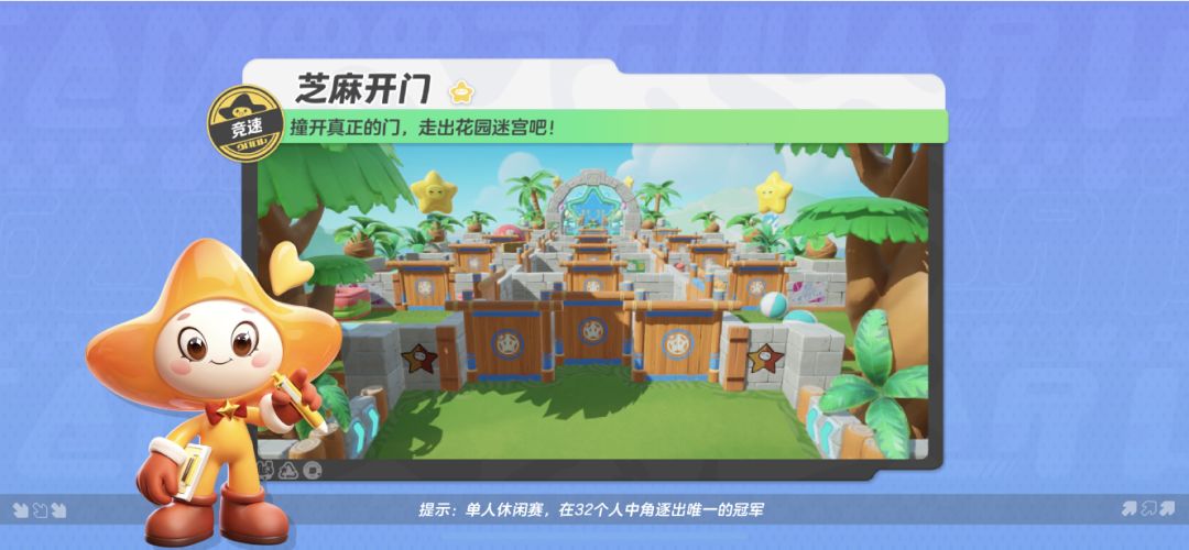 今天星妹要和大家介绍的地图与以往有所不同,在这里选择大于努力!它就是竞速地图——【芝麻开门】!星宝们需要在规定时间内经过层层木门考验,通过真正的门冲向终点。敲黑板!!真正的门是会随机变换的哦~星宝们死记硬背是莫得用的,不过跟着星妹提前熟悉赛道,相信还是可以大大降低走出迷宫的难度哒~接下来就跟着星妹一起开始花园迷宫的冒险之旅叭! 【赛前小贴士】⭐整个比赛的赛区主要分为空旷门墙赛区和狭窄矩形赛区两部分