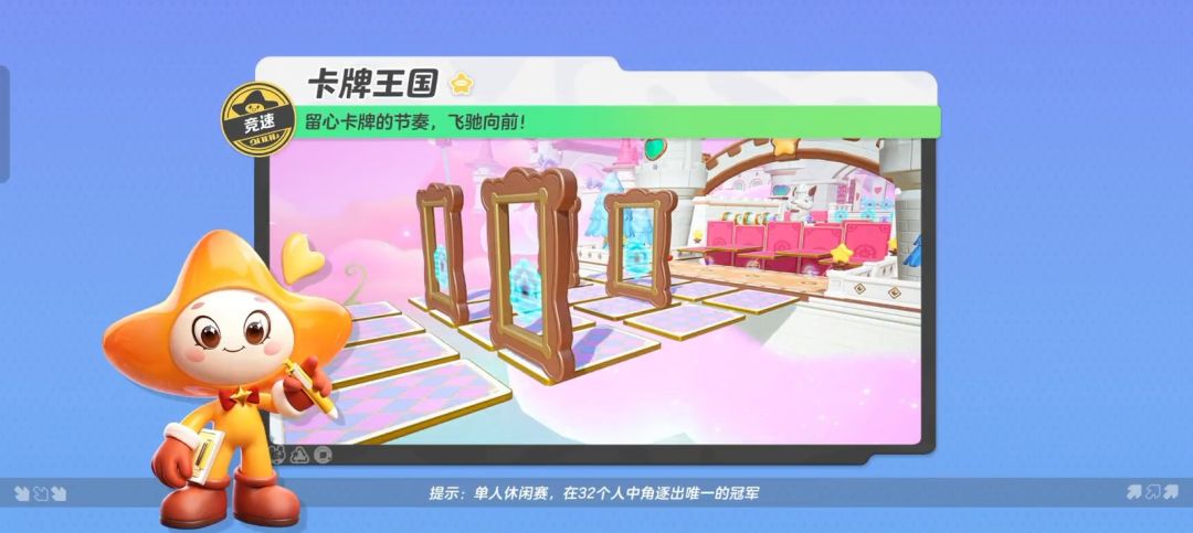 在梦幻的粉云之上,一个充满魔法与奇遇的卡牌赛道悄然展现在星宝们的眼前,卡牌翻飞转动......星宝们能否抓住卡牌移动的规律,安全通过呢? 【卡牌王国】是一张竞速图,地图中的卡牌都在有节奏移动或翻转,星宝们需要在规定时间内,穿过由卡牌组成的道路到达终点,即可获得游戏的胜利! 接下来就让就跟着星妹一起去卡牌王国里一探究竟叭~ 首先当星宝们从卡牌塔下穿过后,有两种道路可以选择:中间翻转的卡牌和两侧有爱