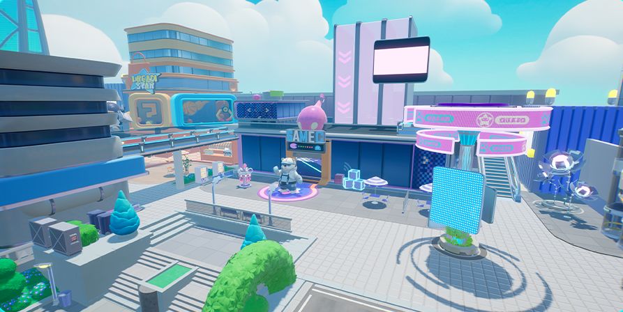 是你让我的世界从此变成粉红色~当HELLO KITTY小镇遇上躲猫猫,每个角落都弥漫着萌趣和甜蜜的气息,最近,星妹发现不少星宝总是在新地图里迷失方向,别怕,星“攻略达人”来救场啦! 首先,跟着星妹熟悉一下HELLO KITTY小镇的地图分布,从搜捕者出生点的阳台一跃而下 映入眼帘的就是小镇中心标志HELLO KITTY雕像。 沿着雕像右边的阶梯往上走就能抵达服装店,门口的哈士奇石雕很是显眼。