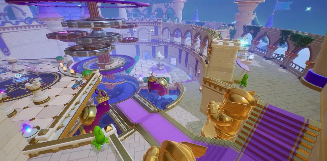 深紫色的天幕之下 有一座雄伟而充满奇趣的城堡 时钟的齿轮“咔嗒、咔嗒”运作 城堡的地面像指针逆时针转动 这里就是躲猫猫的新地图【时光城】! 快跟上星妹的脚步,别走丢啦~ 星月的光辉从夜空中洒落 金色士兵雕像守卫这座云中古堡 层层叠叠的齿轮是时光城的核心 它已经这样运转了不知多久 从城堡上空俯瞰时光城 外圈的圆环长廊分为两层 城堡中央巨大的齿轮机械轴 连接着空中缓慢旋转的扇形地面 这样复杂精巧的建筑