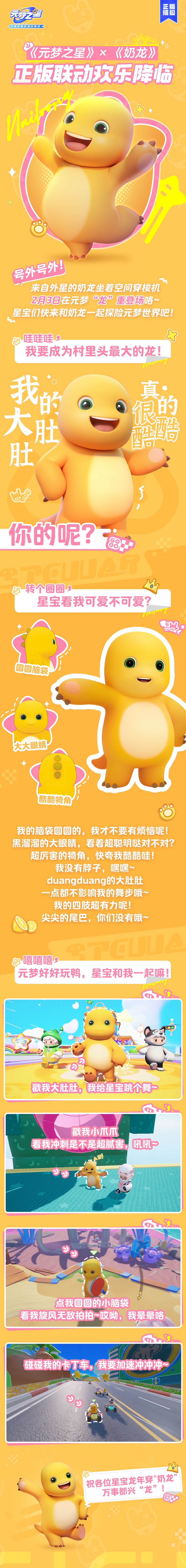 “我的大肚肚,真的很酷酷! 我要减肥肥,我要变瘦瘦! 今天的体重还是那么稳定哦~ 那就来根烤肠‘七七’吧!” 嘿嘿,是谁还没听过这熟悉的台词? 黄黄的皮肤、duangduang的肚肚 谁还认不出? 没错!就是TA! “村里头最大的龙”——奶龙~ 今天,星妹为大家带来爆炸新闻! 《元梦之星》和《奶龙》联动官宣啦! 超好玩的元梦之星 遇上搞笑又蠢萌的奶龙 到底会擦出什么样的火花呢? 星妹悄悄告诉大家哦