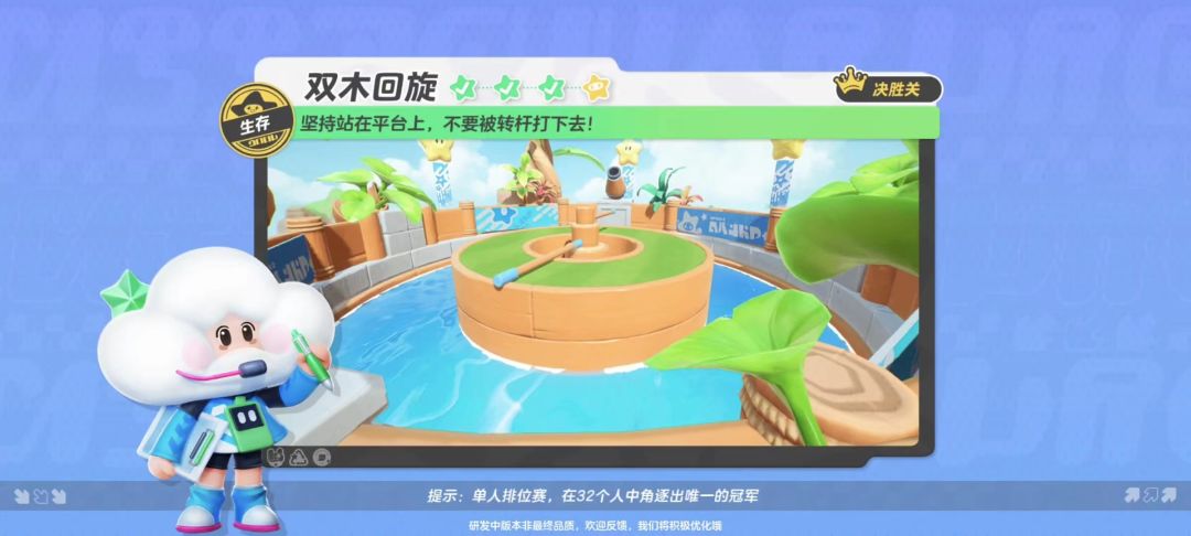 当当当当,欢迎来到——元梦之星地图攻略大课堂!这个栏目的攻略内容都是来源于星宝们的投稿哦,快来一起看看吧! 哈喽,各位星宝们,又到了给大家讲解刺客关卡的时间了,快点来给我捧场撒花!本期给大家带来的是排位赛刺客关卡——双木回旋的攻略。接下来让我带大家了解如何在双木回旋中努力生存并完美夺冠吧! 【关卡特色——坚持到底 切莫掉水里】 双木回旋的关卡特色是:要求玩家能够持续站在平台上,不要被转杆打下水亦