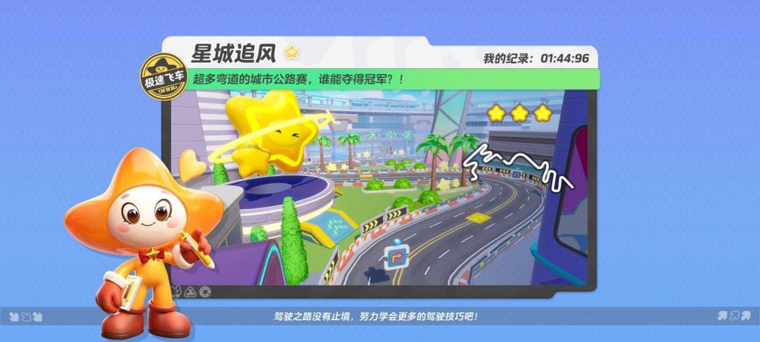 驾驶赛车超越风速,在星城的公路上疾驰~ 【星城追风】是极速飞车玩法里的一张竞速地图,星宝们游玩时需要驾驶赛车穿过公路赛道,在规定时间内到达终点取得胜利! 快跟上星妹的脚步,一起来看看这张地图吧! 进入游戏后,在候场区域等待倒计时期间,星宝们就可以长按加速键提前热身,准备冲刺啦!冲出赛道后,加速键右上角的氮气加速键也会亮起,星宝们可以点击氮气加速键来保持我们的优势哦(✪ω✪) 开局后迎面而来的就