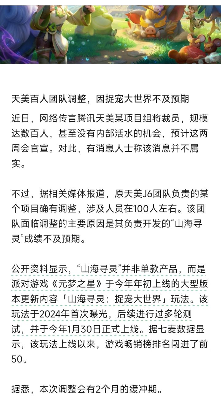 网传天美工作室将裁员数百人,消息指向元梦之星的山海寻灵项目组。相关人士已辟谣澄清,所谓大规模裁员的消息并不属实。这波传闻扩散快,主要是近期行业项目波动的消息偏多,容易引发猜测。实际是天美J6团队的项目进行调整,涉及100余人,并非数百人。受影响员工有2个月缓冲期,公司在推进内部活水转岗,离职可拿N+1补偿。比起行业里一些直接优化的操作,这套处理方式对员工算是相对负责。目前天美内部有50