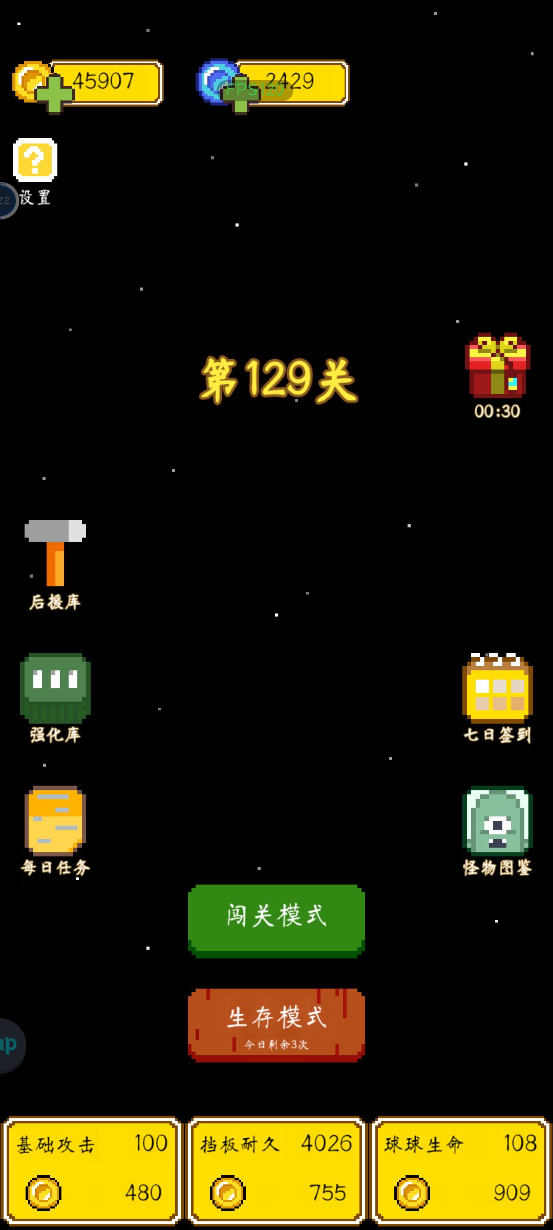 14转, 闯关1500关游戏心得分享 游戏属于简单易上手的,比较适合偶尔打发时间,300关后可以转生,获得一个随机属性和蓝色币(关卡越高币越多),以后每转一次提高20关卡才可以再转生。 一,游戏前期建议,球球,金币球(蓝色币主要先升级这个),板板 满级基础板(任何模式都是最佳,一二转前建议升级满 出生8000生命yyds)没满级可用恶魔板,下不重复,闯关30-50左右进入无尽模式(无尽模式金币