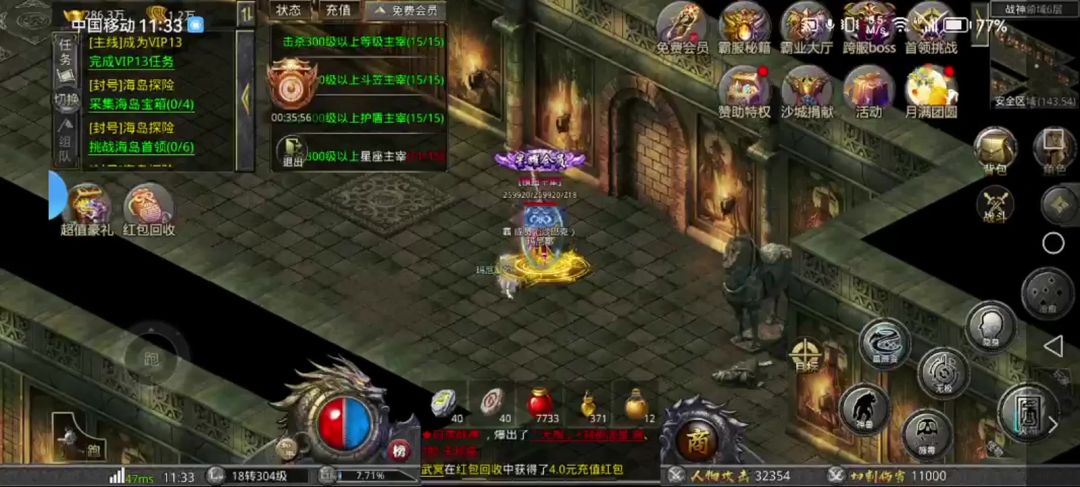 进入游戏界面指引创建角色 完成主线任务1击杀(太初)三叉魔怪,狼牙魔怪各3只 完成任务领VIP1特权 1开启全图挂机 2每天领取天关灵符 特权礼包现金红包5元,1品血玉,30000元宝,5000经验丹 此时你会发现背包不够用,需要完成主线任务开通VIP2特权就可以激活回收功能了 完成主线任务2 完成任务领VIP2特权 1开启随身回收 2开启全图挂机 3每天领取天关灵符 特权礼包现金红包5元,1品血
