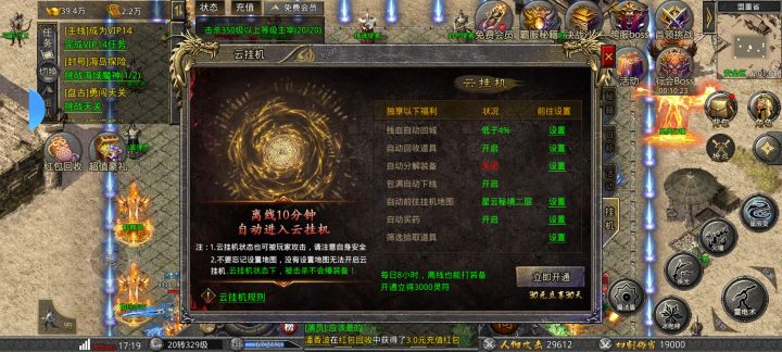 进入游戏界面指引创建角色 完成主线任务1击杀(太初)三叉魔怪,狼牙魔怪各3只 完成任务领VIP1特权 1开启全图挂机 2每天领取天关灵符 特权礼包现金红包5元,1品血玉,30000元宝,5000经验丹 此时你会发现背包不够用,需要完成主线任务开通VIP2特权就可以激活回收功能了 完成主线任务2 完成任务领VIP2特权 1开启随身回收 2开启全图挂机 3每天领取天关灵符 特权礼包现金红包5元,1品血
