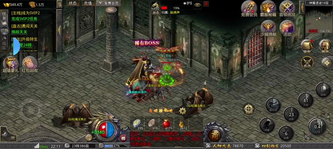 进入游戏界面指引创建角色 完成主线任务1击杀(太初)三叉魔怪,狼牙魔怪各3只 完成任务领VIP1特权 1开启全图挂机 2每天领取天关灵符 特权礼包现金红包5元,1品血玉,30000元宝,5000经验丹 此时你会发现背包不够用,需要完成主线任务开通VIP2特权就可以激活回收功能了 完成主线任务2 完成任务领VIP2特权 1开启随身回收 2开启全图挂机 3每天领取天关灵符 特权礼包现金红包5元,1品血