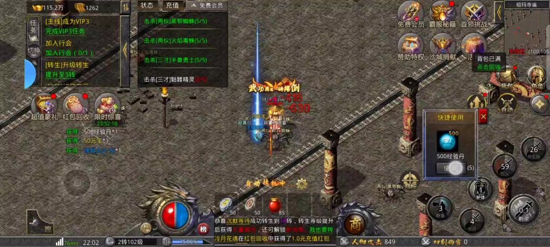 进入游戏界面指引创建角色 完成主线任务1击杀(太初)三叉魔怪,狼牙魔怪各3只 完成任务领VIP1特权 1开启全图挂机 2每天领取天关灵符 特权礼包现金红包5元,1品血玉,30000元宝,5000经验丹 此时你会发现背包不够用,需要完成主线任务开通VIP2特权就可以激活回收功能了 完成主线任务2 完成任务领VIP2特权 1开启随身回收 2开启全图挂机 3每天领取天关灵符 特权礼包现金红包5元,1品血