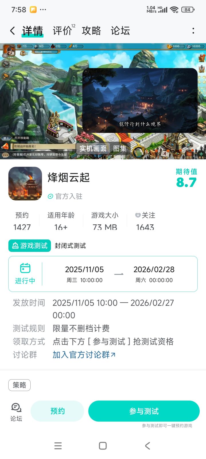 好消息!玩家们期待了好久的《烽烟云起》开启测试啦,这次的测试形式是不限量删档计费测试哦,心动的小伙伴们不要再犹豫了,快行动起来,一起来玩吧,还有机会赢取京东卡奖励!大家冲鸭~【活动时间】5月8日----5月26日【活动对象】下载并安装进入游戏的玩家【活动规则】联盟军功达到1000,可参与本活动。首先要加入一个联盟,在世界中攻打其他玩家的城市,或者防御他人进攻时,如果消灭对方士兵,可获得