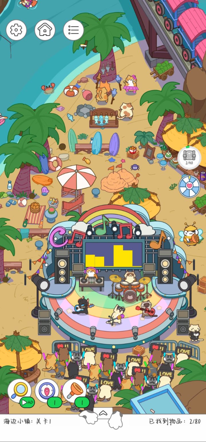 2.玩的形式可以多加一些;目前大部分关卡都是单纯找被藏起来的东西,主要是考耐心和细心,但是太单一了,虽然有一些道具点击后才能掉落东西,有一些关卡是在房子等地点有一些组合或者道具互动的小巧思,但是这种关太少,一次也只有三个。我建议比如说触碰小猫或者和小猫互动掉落东西,可以把东西藏在移动的汽车火车上,需要我们稍微思考的这种小巧思(纯短暂建议,不完善哈)。