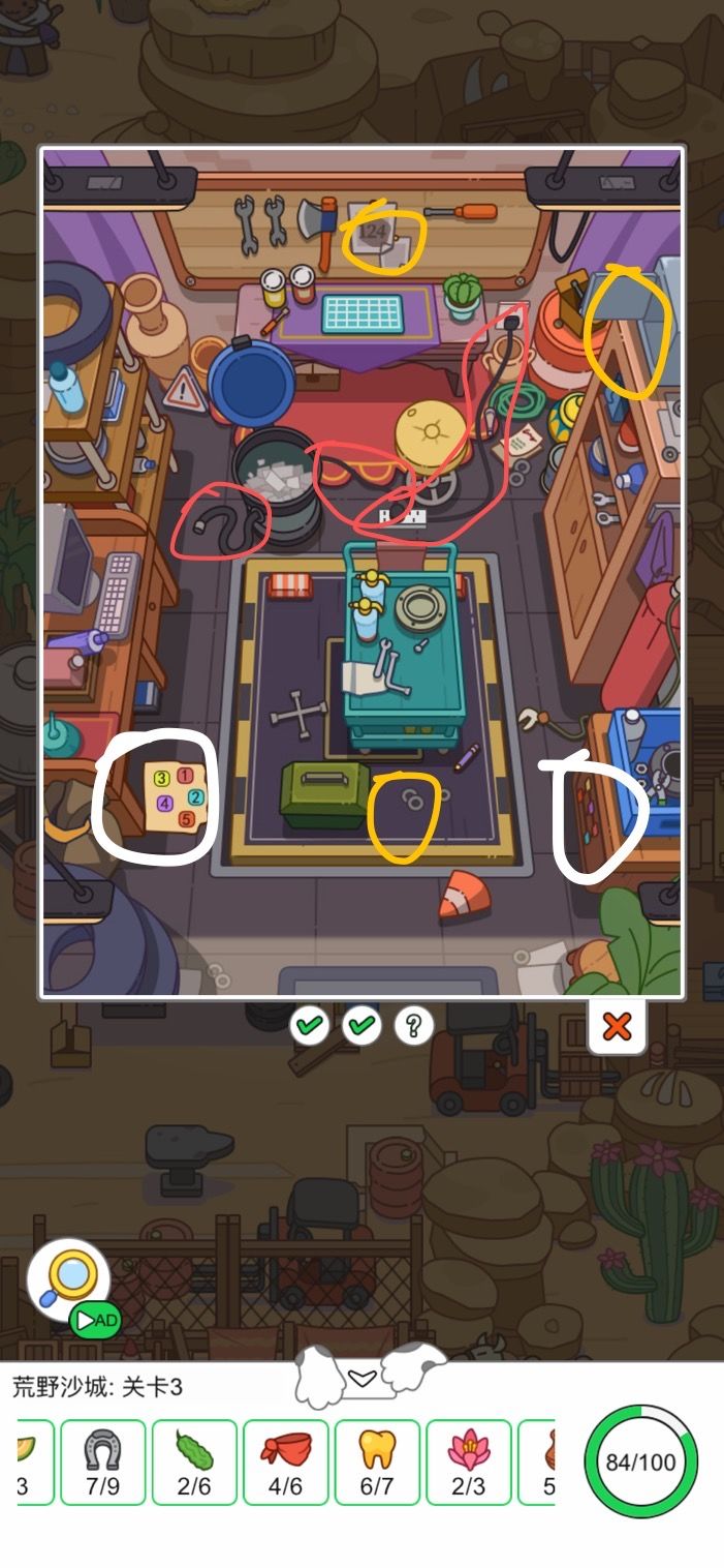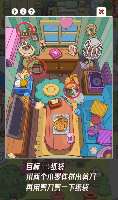 疯狂找东西攻略——第一章第二小关 最近对这个小游戏非常上头 ,真的太治愈啦! 看到很多小伙伴找不到小房间里面的物品所以做了一个小攻略[表情_微笑] 这个是第一章的第二个地图里面的小房间,总共有三个物品 目标一:纸袋 用两个小零件拼出剪刀 再用剪刀剪一下纸袋 目标二:羽毛铃铛 将电池放入遥控器 再拖动遥控器打开空调 空调的风会吹出笼子内的红色羽毛 再将红色羽毛拼接到羽毛铃铛上 目标三:奖章 打开书本