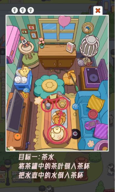小游戏——疯狂找东西攻略3(第一章第四关) 目标一:茶水 将茶罐中的茶叶倒入茶杯 把水壶中的水倒入茶杯 得到茶水 目标二:音符 将唱片机零件拼好 放入唱片,得到音符 目标三:半个橙子 打开柜子,获得小刀 用小刀切一下橙子#单机游戏#游戏安利#攻略