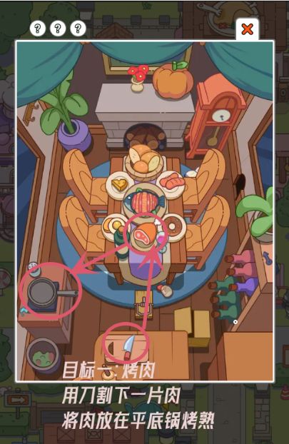 小游戏——疯狂找东西攻略2(第一章第三关) 目标一:烤肉 用刀割下一片肉 将肉放在平底锅烤熟 目标二:鼠鼠🐭 将芝士放在捕鼠夹上 再将捕鼠夹放在鼠鼠洞口 目标三:小鸟 将指针零件拼到时钟上 小鸟会自动弹出