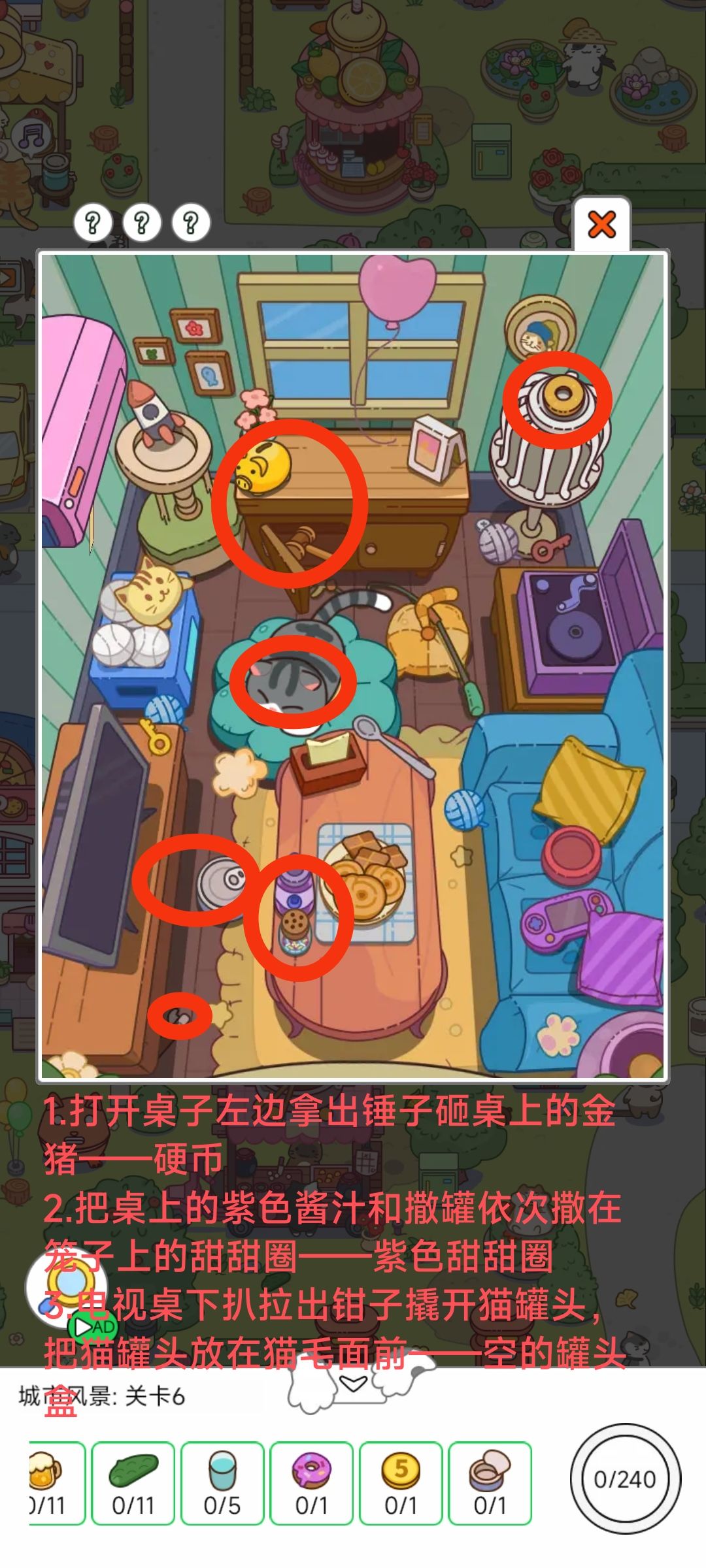 1根据教程:合成剪刀,剪刀剪袋子(袋子) 2电池放空调遥控器后盖,空调遥控器启动空调,空调的风把笼子里的红色羽毛吹飞出来,红色羽毛拖动到铃铛(羽毛铃铛) 3点击桌上的粉色书本,里面有紫色书签,沙发的金币拖动到书签上(徽章) 1时钟缺了分针,右下角酒柜上面有分针,分针拖动到时钟,弹出来一只布谷鸟(布谷鸟) 2奶酪放捕鼠夹上,捕鼠夹拖动到老鼠洞门口,等待老鼠上当捕鼠夹(老鼠) 3案板的刀切鸡腿,鸡腿肉