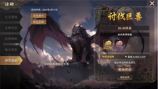 在封神大陆中,各州隐藏的神秘洞天内往往藏匿着凶猛的上古巨兽,但偶尔灵气动荡之时这些尘封已久的洞天也会悄然打开大门等待着诸位将军进入其中一探究竟。 当诸位将军主线任务推进至指定章节后即可解锁联盟功能,当“洞天福地”活动进入开放期后诸位将军需要以联盟为单位参与该活动。 与其他玩法不同,洞天讨伐活动不定时开放,但在开放前诸位将军可通过主界面活动按钮对开放时间进行预览,方便诸位将军与盟友一并协商时间参与其