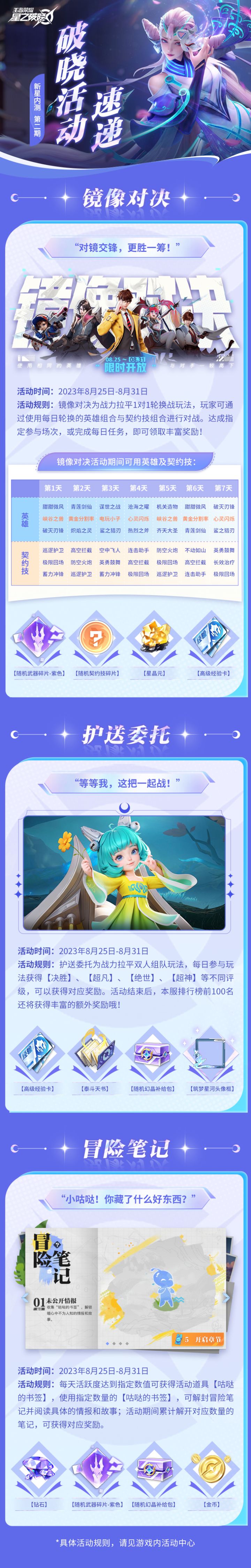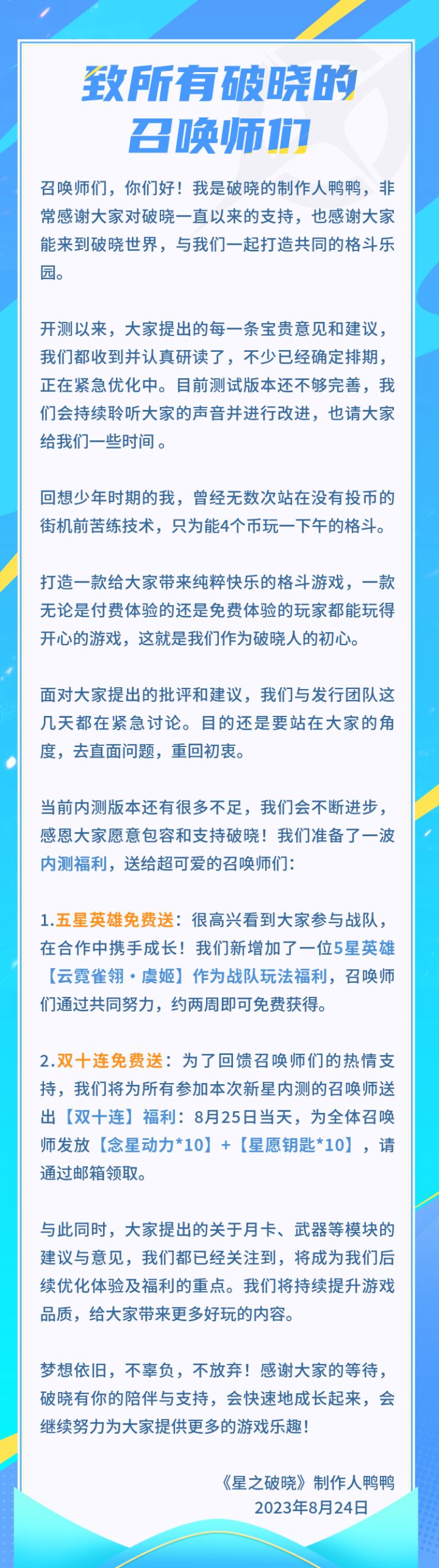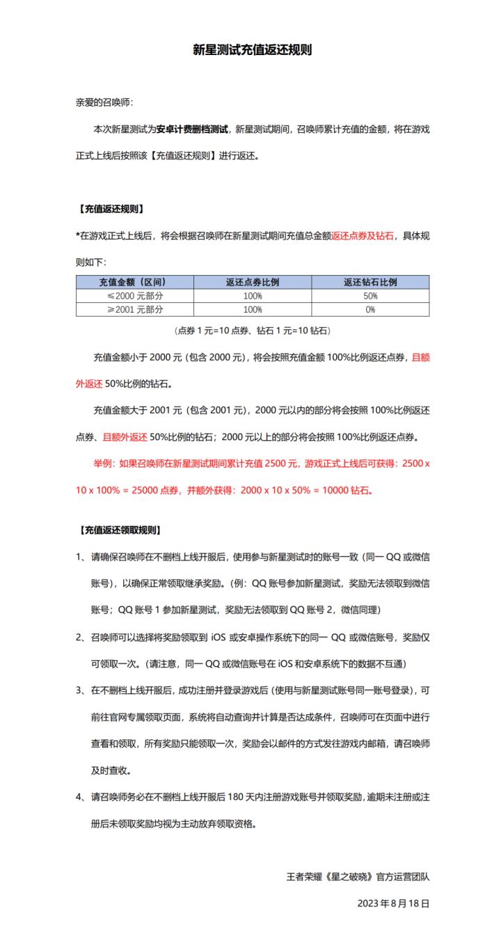 亲爱的召唤师:感谢您对王者荣耀《星之破晓》新星测试的热情关注和支持!游戏全区全服将于8月25日10:00完成周常更新,本次更新不会影响您的正常体验。【本次更新内容】一、福利放送● 为回馈参与新星测试的全体召唤师,我们将在本次更新当天为召唤师们发放:【念星动力】*10+【星愿钥匙】*10,届时请召唤师们通过邮箱获取。● 我们新增加了一位5星英雄【云霓雀翎·虞姬】作为战队玩法福利,召唤师们参