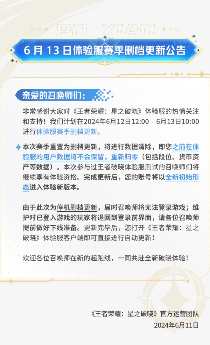 亲爱的召唤师们:非常感谢大家对《王者荣耀:星之破晓》体验服的热情关注和支持!我们计划在2024年6月12日12:00 - 6月13日10:00进行体验服赛季重置删档更新。在收集召唤师们的众多反馈后,本次我们将对体验服进行全新版本赛季重置。赛季重置将清除召唤师数据,同时本次参与过王者破晓体验服测试的召唤师们将继续享有体验资格!欢迎各位召唤师在新的起跑线,一同共赴全新破晓体验!由于此次为停机删