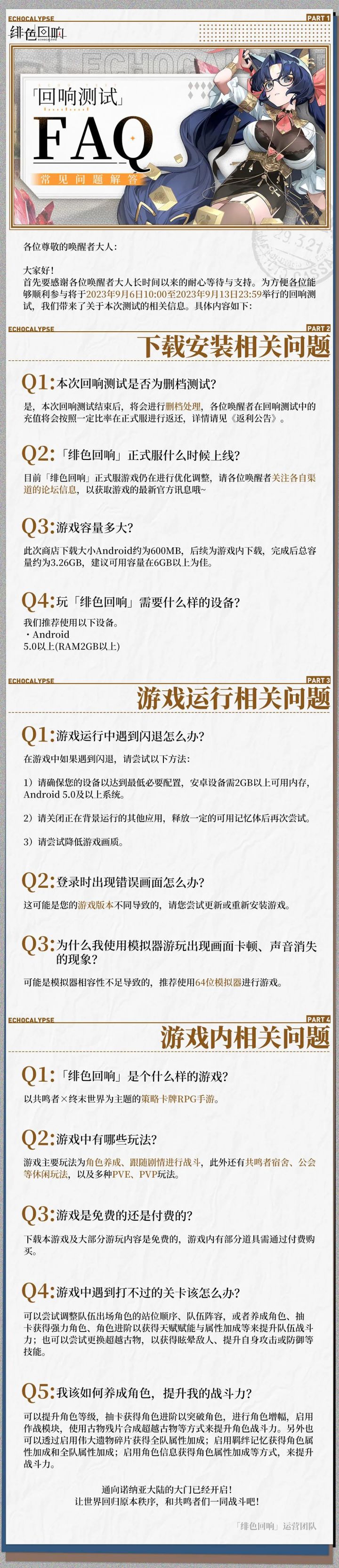 亲爱的唤醒者们,晚上好!「回响测试」将于9月6日开启,我们准备了一些常见问题的对应说明,希望能够帮助唤醒者们更好地体验游戏。感谢唤醒者们一直以来对《绯色回响》的关注与支持,祝大家游戏愉快!#绯色回响