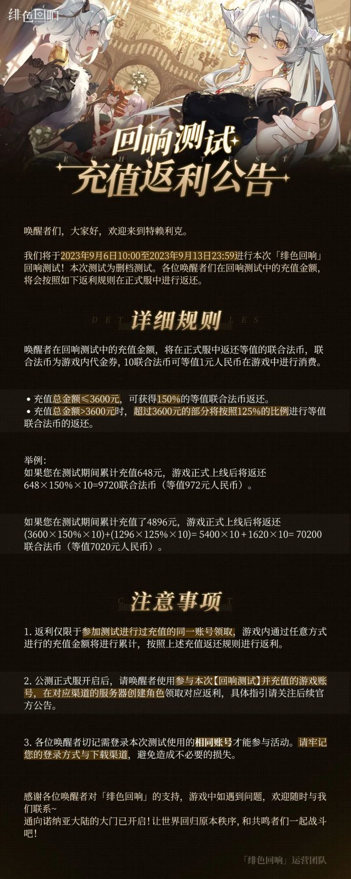 亲爱的唤醒者们,晚上好!「回响测试」将于9月6日开启,本次测试将开放充值功能,测试期间累计充值的金额会在游戏公测后按照一定比例返还至参与测试的对应账号下。具体返利规则如下,敬请留意。#绯色回响
