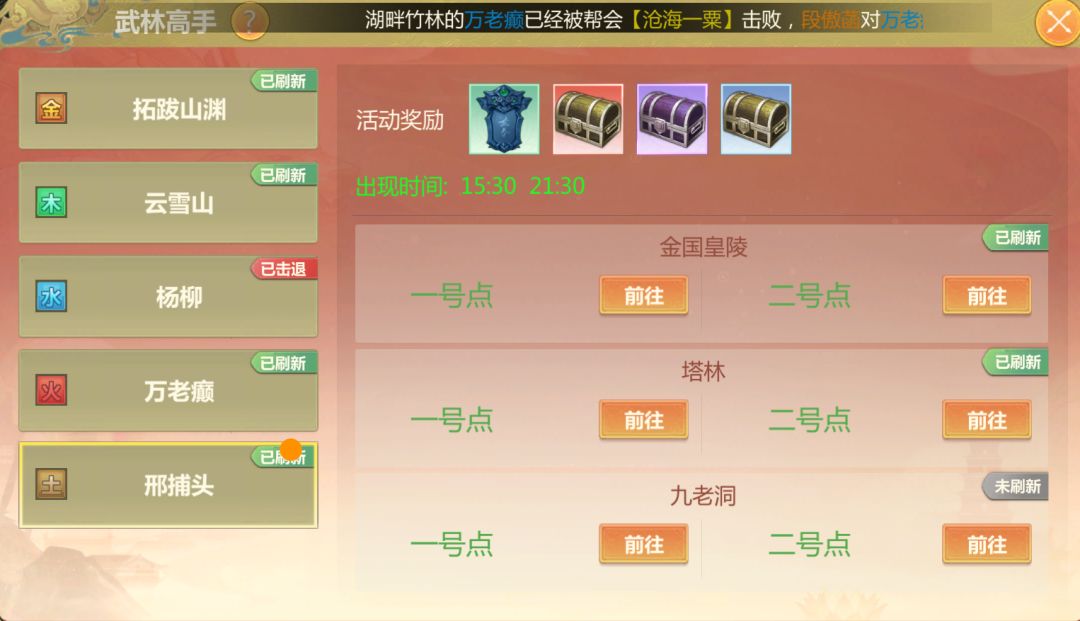 1 引言 作为一名八零后,玩了近二十年的各种游戏,给我留下深刻印象的好游戏不多,西山居的剑侠系列是其中一款,剑侠主打帮会合作与团战。写此攻略,因着心里那份情怀,权当追忆当年的热血与青春。 剑侠前期玩法中,武林高手活动最考验一个帮会的团结合作与执行力,BOSS收割好的话对帮会成员收益也是最大。 2 武林高手活动攻略 2.1 活动时间 每天武林高手活动有2次,15:30、21:30各一次。 2.