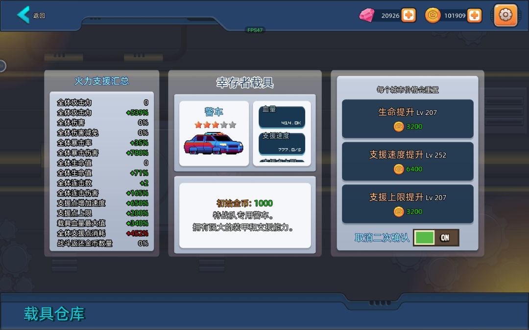 0.1.8版本萌新从零开始速通 一.升星 1.警车必买的,等有钱再升星。 2.升星顺序,狗哥,越狱,轻坦,炼金 二.花费金币 1.载具提升,每个城市都会重置载具提升的价格。 生命提升,不买。 支援速度提升,必买,每关都要买,但是不用太多。 支援上限提升,可买,买一次只要50金币和白送没什么区别,但是有警车不买也没事。 2,军火支援。 连击,必买,但是很难刷到。 百分比加攻击力,暴击伤害,暴击率,连