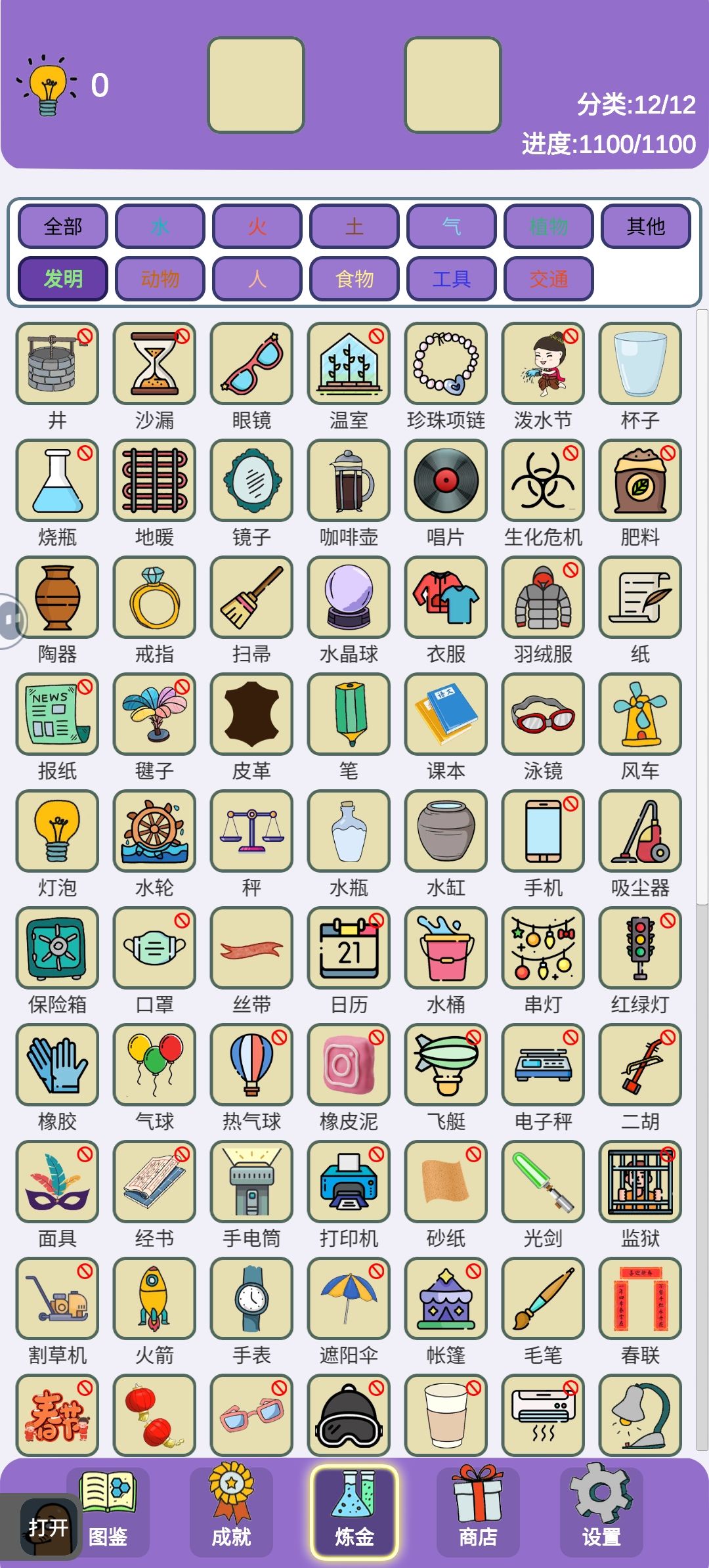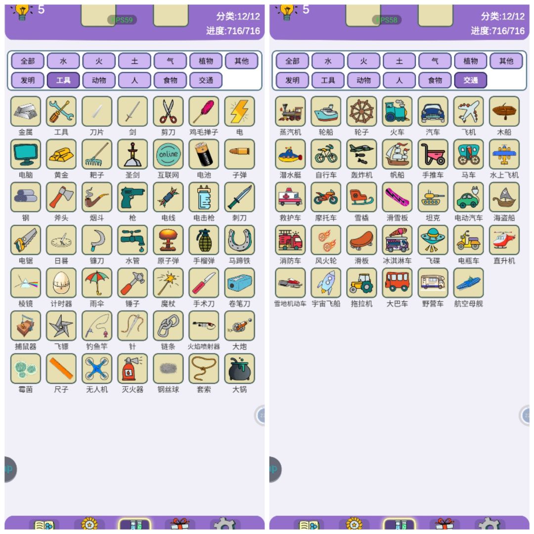 地平线=天空+陆地 生命=沼泽+能量 玻璃=火+沙子 时间=沙子+玻璃 木头=斧头+树 线=棉花+工具 布=线+工具 钱=纸+黄金 白天=太阳+时间 病=人+雨 寒冷=同上 风扇=工具+风 购物=人+钱 吃土=人+购物 赌博=钱*2 爱情=人*2 探险=人+火把 浮游生物=水+生命 骨头=尸体+时间 信=纸+笔 夜晚=月亮+时间 地图=纸+陆地 藏宝图=海盗+地图 礼物=圣诞老人+圣诞树 包装纸=