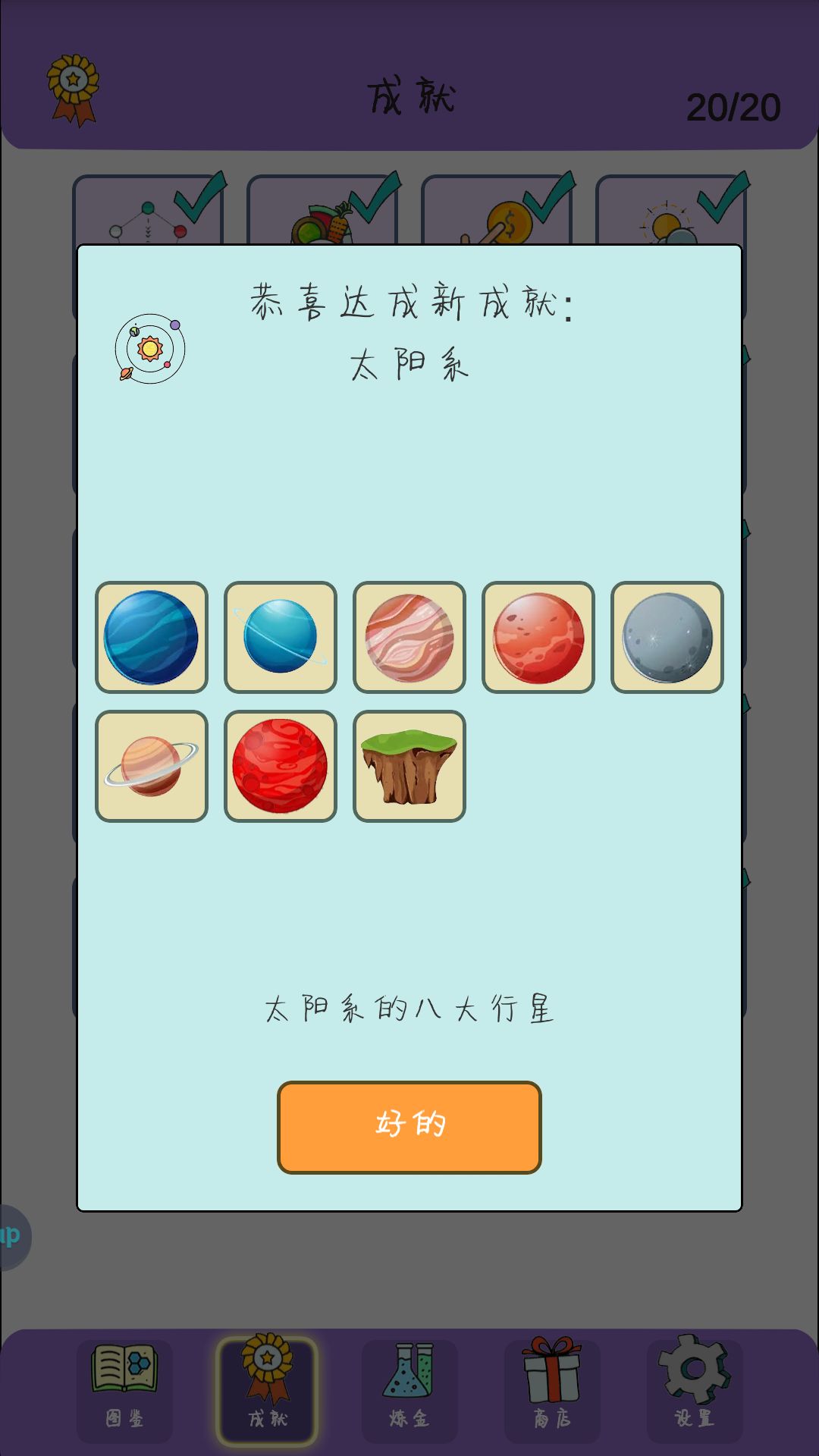 该成就的关键在于解锁【行星】 行星=陆地+空间 空间=星星+天空 星星=夜晚+天空 夜晚=月亮+天空 月亮=石头+天空 石头=空气+岩浆 天空=空气+云 云=空气+水蒸气 水蒸气=水+火 岩浆=陆地+火 由此可见【天空】是天空狭义物的基本单位,【空气】是天空广义物的基本单位。 1.地球 即陆地 2.水星 月亮+行星 3.金星 沙子+行星 4.火星 锈+行星 5.土星 戒指+行星 6.木星 空气+行