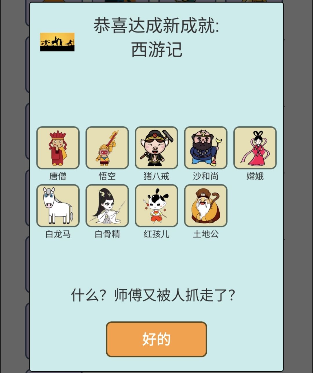唐僧=水蒸气+人 人=陆地+生命 生命=沼泽+能量 悟空=石头+人 猪八戒=猪+耙子 猪=牲畜+泥浆 牲畜=农民+生命 农民=人+植物 耙子=工具+干草 干草=草+太阳 工具=金属+人 金属=火+石头 沙和尚=唐僧+沙子 沙子=空气+石头 嫦娥=月亮+美女 月亮=天空+石头 美女=珍珠项链+人 珍珠项链=珍珠+珍珠 珍珠=贝壳+沙子 贝壳=浮游生物+石头 浮游生物=水+生命 白龙马=唐僧+马 马=