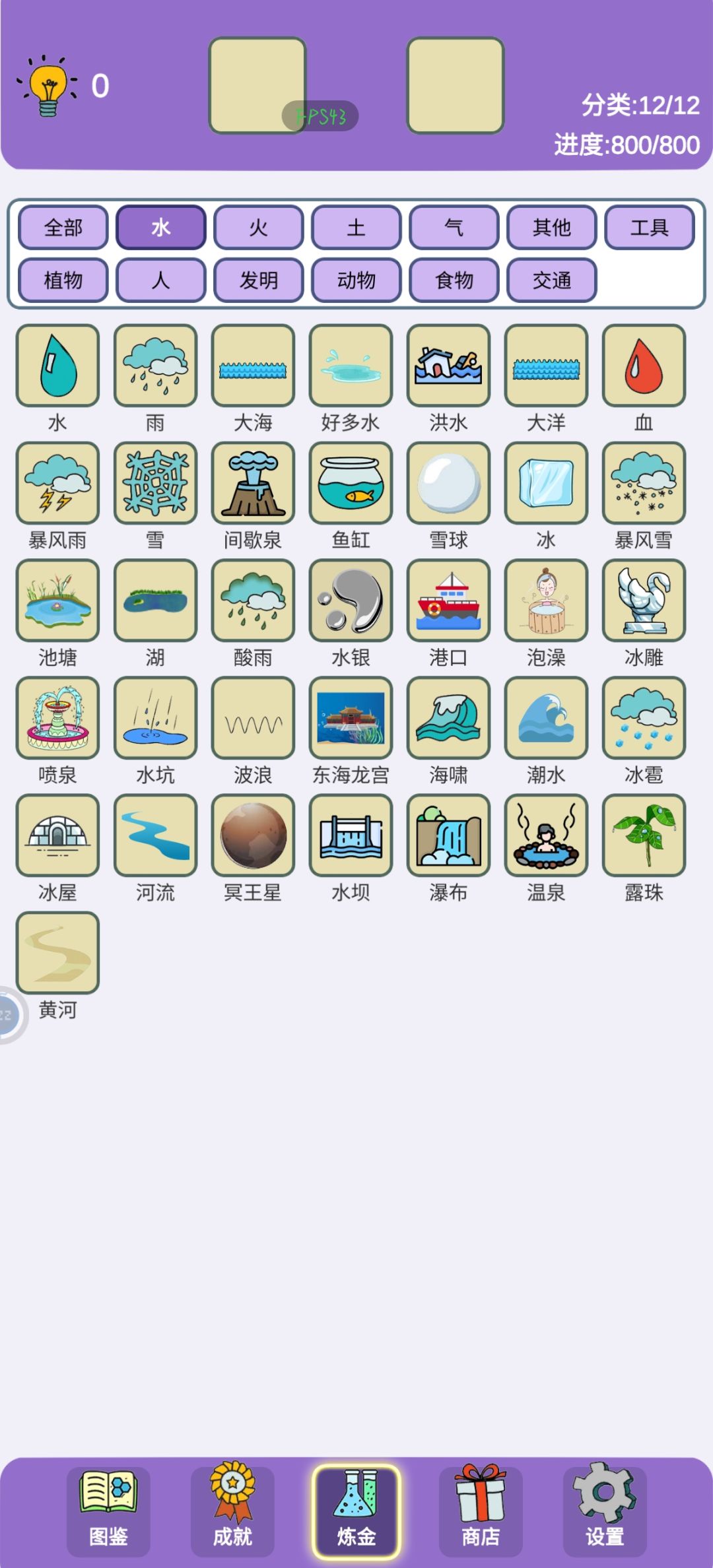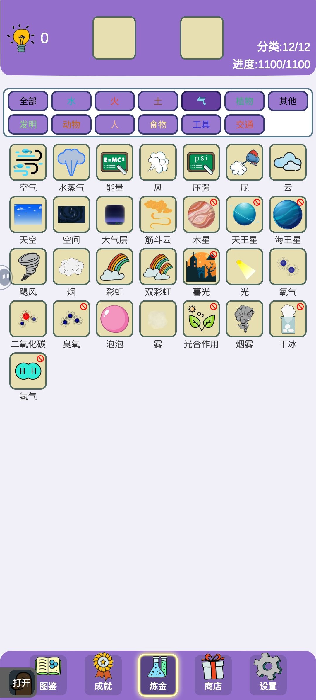 水蒸气=火+水 云=水蒸气+空气 雨=水+云 泥浆=水+陆地 植物=雨+陆地 沼泽=泥浆+植物 能量=空气+火 生命=沼泽+能量 人=陆地+生命 岩浆=陆地+火 石头=空气+岩浆 沙子=石头+空气 玻璃=沙子+火 时间=玻璃+沙子 金属=火+石头 工具=人+金属 田地=陆地+工具 农民=人+田地 树=植物+时间 水果=树+农民 蔬菜=水果+田地 果汁=水+水果 酒=时间+水果 森林=树+树 野生动