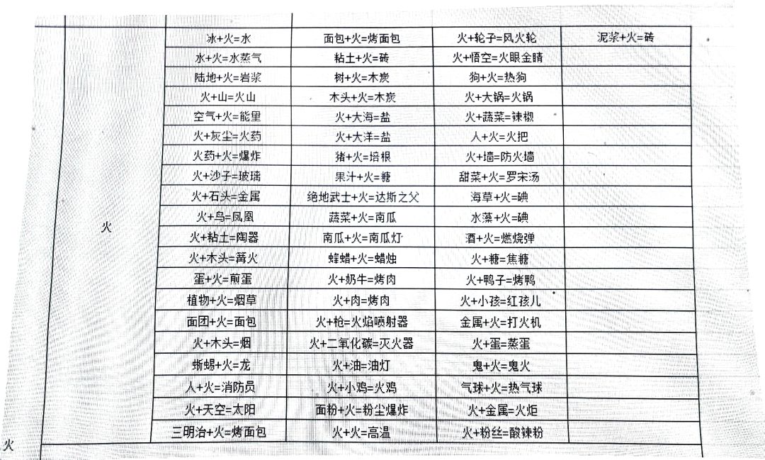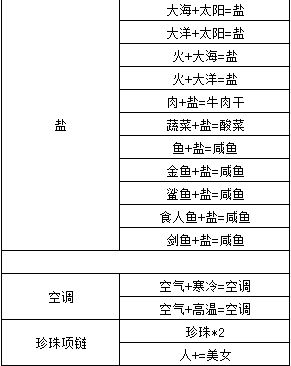 火+大锅=火锅 小孩+泡泡=泡泡玛特 水+种子=水稻 水+水稻=米饭 美女+奶茶=奶茶妹妹 黄油+饼干=曲奇 牛奶+油=奶油 蝴蝶+情侣=梁祝 情侣+沉船=杰克和肉丝 小鸡+蔬菜=菜鸡 鲨鱼+西瓜=鲨瓜 鲨鱼+小孩=鲨孩子 鲨鱼+蛋=鲨蛋 火+蔬菜=辣椒 辣椒+小鸡=辣鸡 大海+行星=海王星 天使+行星=天王星 空气+行星=木星 沙子+行星=金星 月亮+行星=水星 冰+行星=冥王星 蜜蜂+马=马蜂