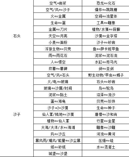 陆地+火=岩浆 空气+岩浆=石头 火+石头=金属 水+陆地=泥浆 水+空气=雨 雨+陆地=植物 泥浆+植物=沼泽 空气+火=能量 沼泽+能量=生命 陆地+生命=人 金属+人=工具 空气+石头=沙子 火+沙子=玻璃 沙子+玻璃=时间 植物+时间=树 工具+树=木头 木头+人=房子 火+木头=篝火 房子+篝火=壁炉 房子+壁炉=烟囱#攻略#游戏安利#单机游戏#游戏推荐