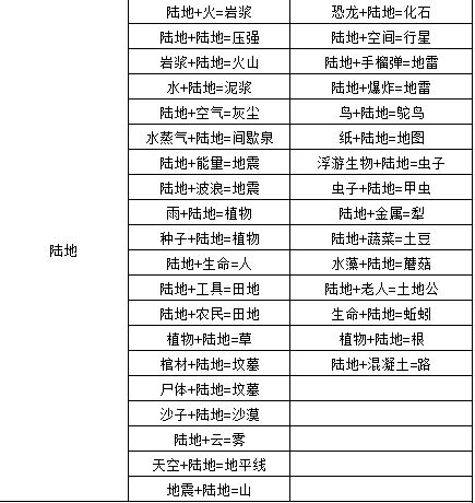 陆地+火=岩浆 空气+岩浆=石头 火+石头=金属 空气+火=能量 金属+能量=电 空气+石头=沙子 火+沙子=玻璃 电+玻璃=灯泡 灯泡+电=光 水+陆地=泥浆 水+空气=雨 雨+陆地=植物 泥浆+植物=沼泽 沼泽+能量=生命 陆地+生命=人 人+空气=屁 光+屁=光屁屁 金属+人=工具 沙子+玻璃=时间 植物+时间=树 工具+树=木头 木头+人=房子 光