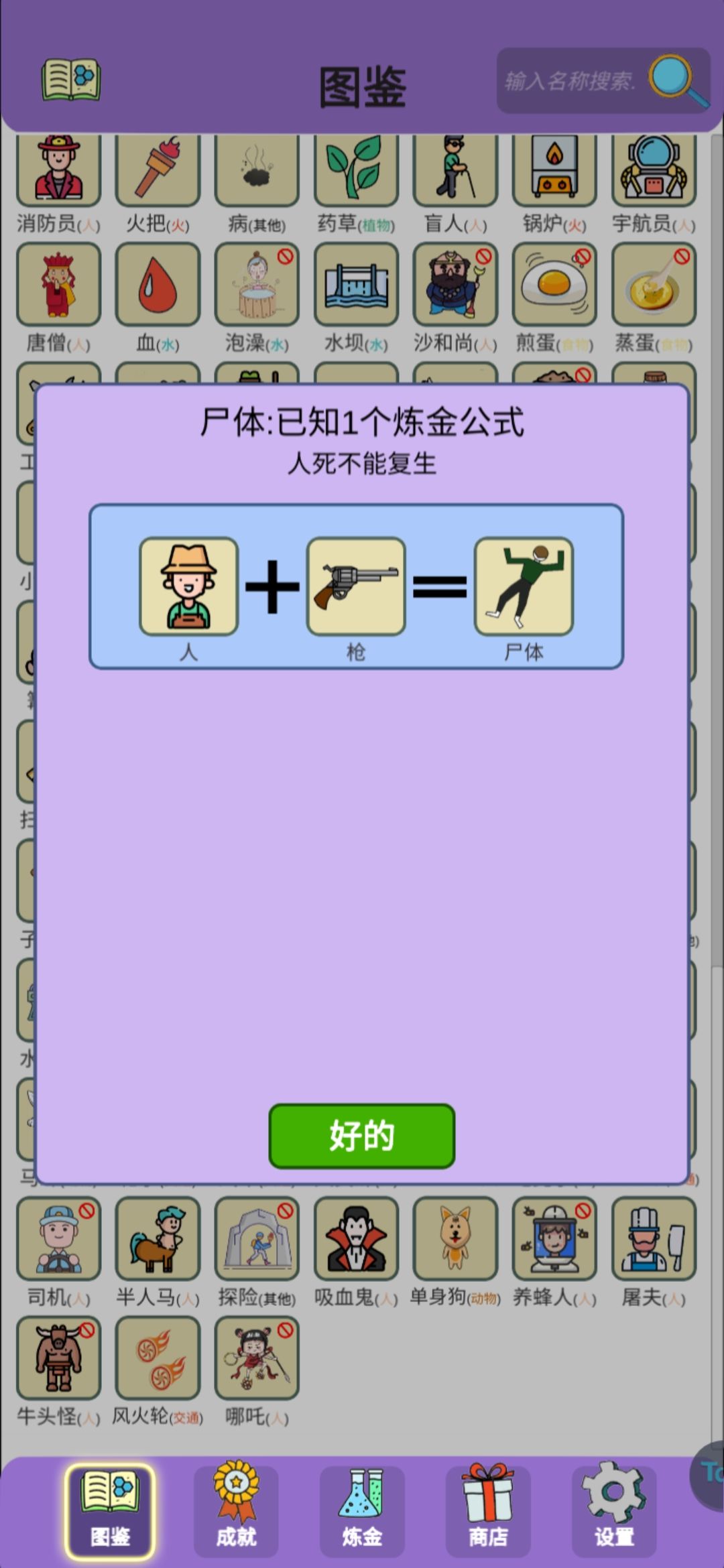 水+陆地=泥浆 水+火=水蒸气 水蒸气+空气=云 云+水=雨 雨+陆地=植物 泥浆+植物=沼泽 空气+火=能量 沼泽+能量=生命 陆地+生命=人 陆地+空气=灰尘 火+灰尘=火药 陆地+火=岩浆 空气+岩浆=石头 石头+火=金属 火药+金属=子弹 子弹+金属=枪 人+枪=s体