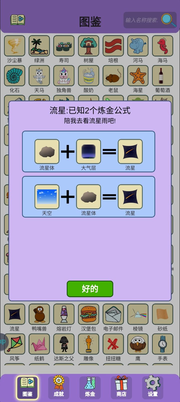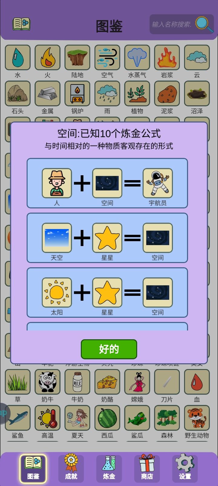 有不知道的细节公式欢迎在评论区留言空气+云=天空天空+石头=月亮天空+月亮=夜晚天空+夜晚=星星工具+金属=盔甲人+盔甲=骑士蛋+水=鱼子鱼子+时间=鱼草+牲畜=奶牛云+牲畜=绵羊镜子+人=双胞胎浮游生物+水蒸气=蟹野生动物+牛奶=猫野生动物+猫=狮子浮游生物+石头贝壳+沙子=珍珠珍珠×2=珍珠项链珍珠项链+人=美女金属+棉花=秤野生动物+沙子=蝎子干草+