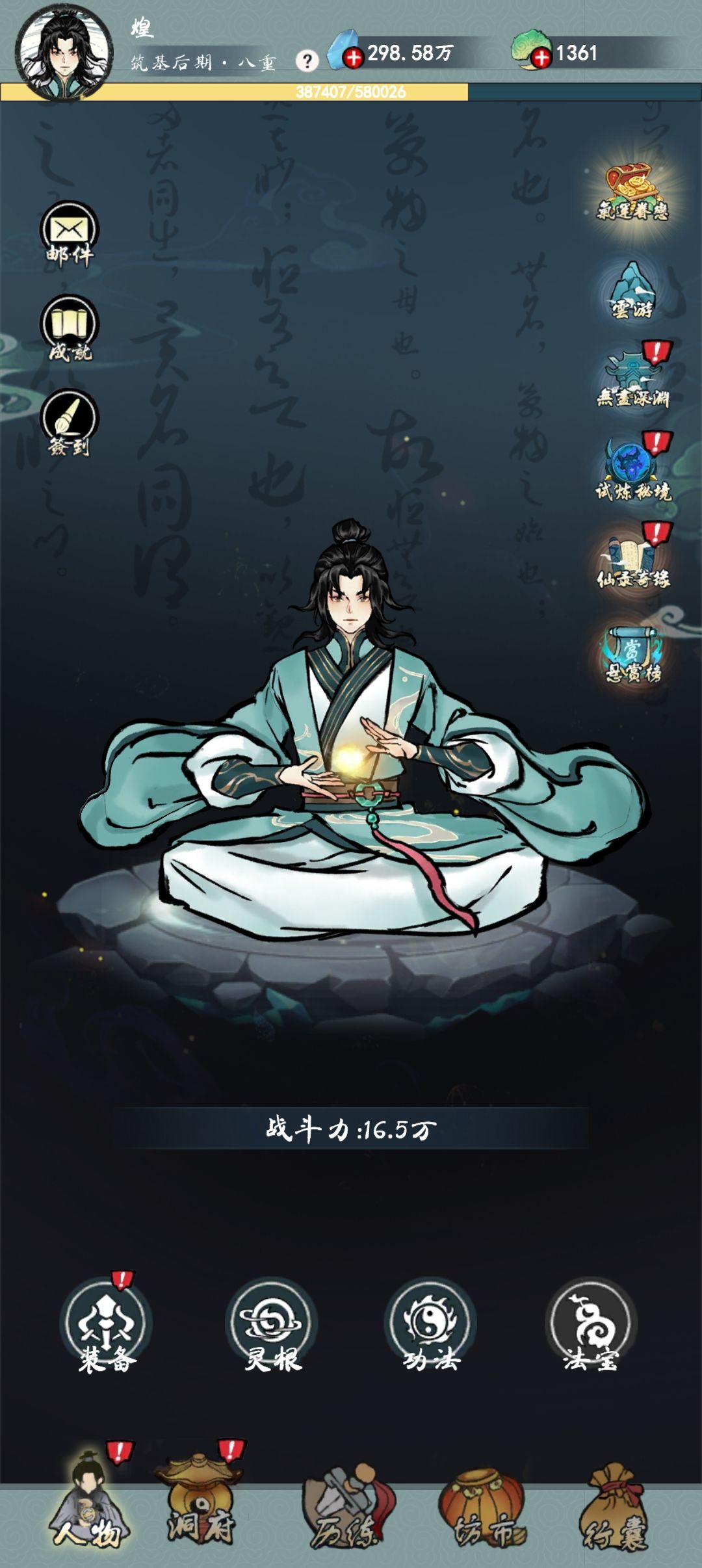 一款水墨修仙挂机游戏,不肝不氪 前期把礼包码拿完,可以弄张月卡 奖励很丰厚,挂机到筑基开始炼丹炼器 炼二阶修为丹一天最多吃十次,最好吃金色 炼器筑基阶段用紫色装备过度就行之后开始做悬赏,只要金紫之后挂机爬塔等到战力升满最后开始打试炼副本 爬塔推荐带眩晕 护盾三剑还有单攻