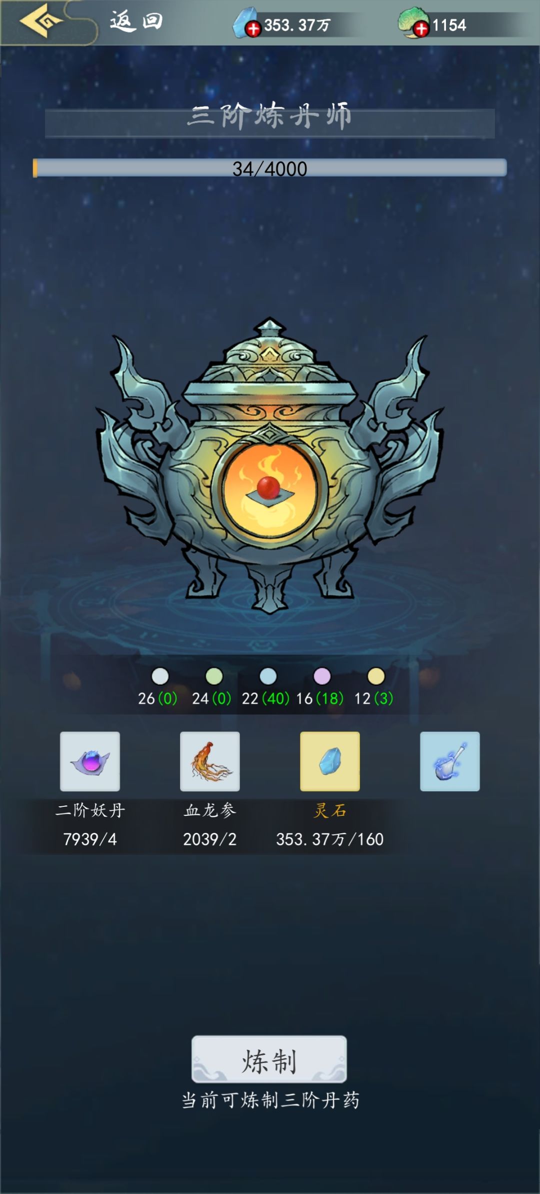 由于新版本等级升的很快,所以萌新要多注重炼丹炼器篇。 成就篇: 萌新进来就不要急着领取给骰子的成就奖励,留着,后面元婴再用。因为云游的奖励是随着境界的提升而提升的,前面的境界,一些奖励没解锁,都是用灵石替代,很浪费。 炼丹篇: 这个游戏炼丹很重要很重要,给的属性特别多,如果后面不想卡关就得炼。 炼丹只有到对应炼丹等级,坊市才会刷新对应等级的丹方,与境界无关。比如说化神对应五阶,如果你炼丹只有四阶,