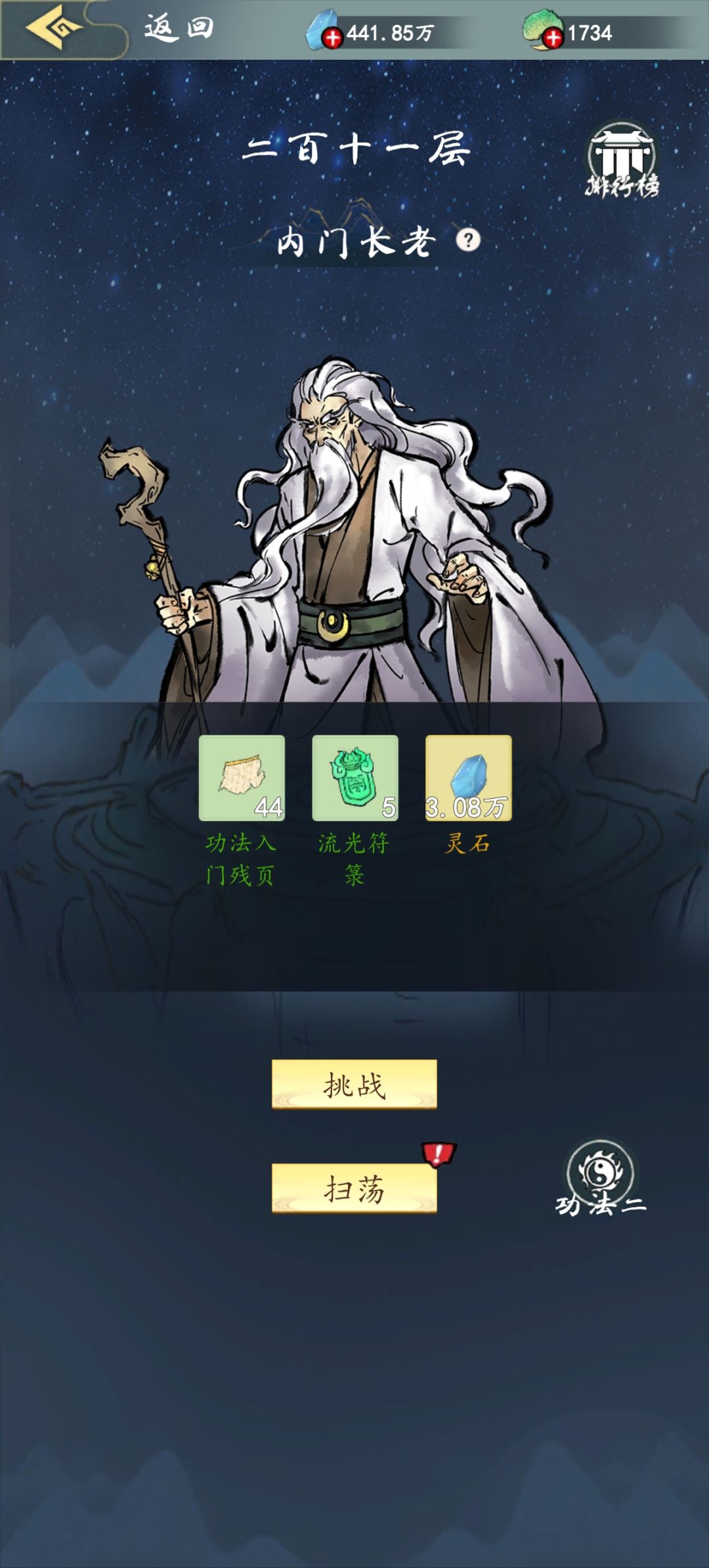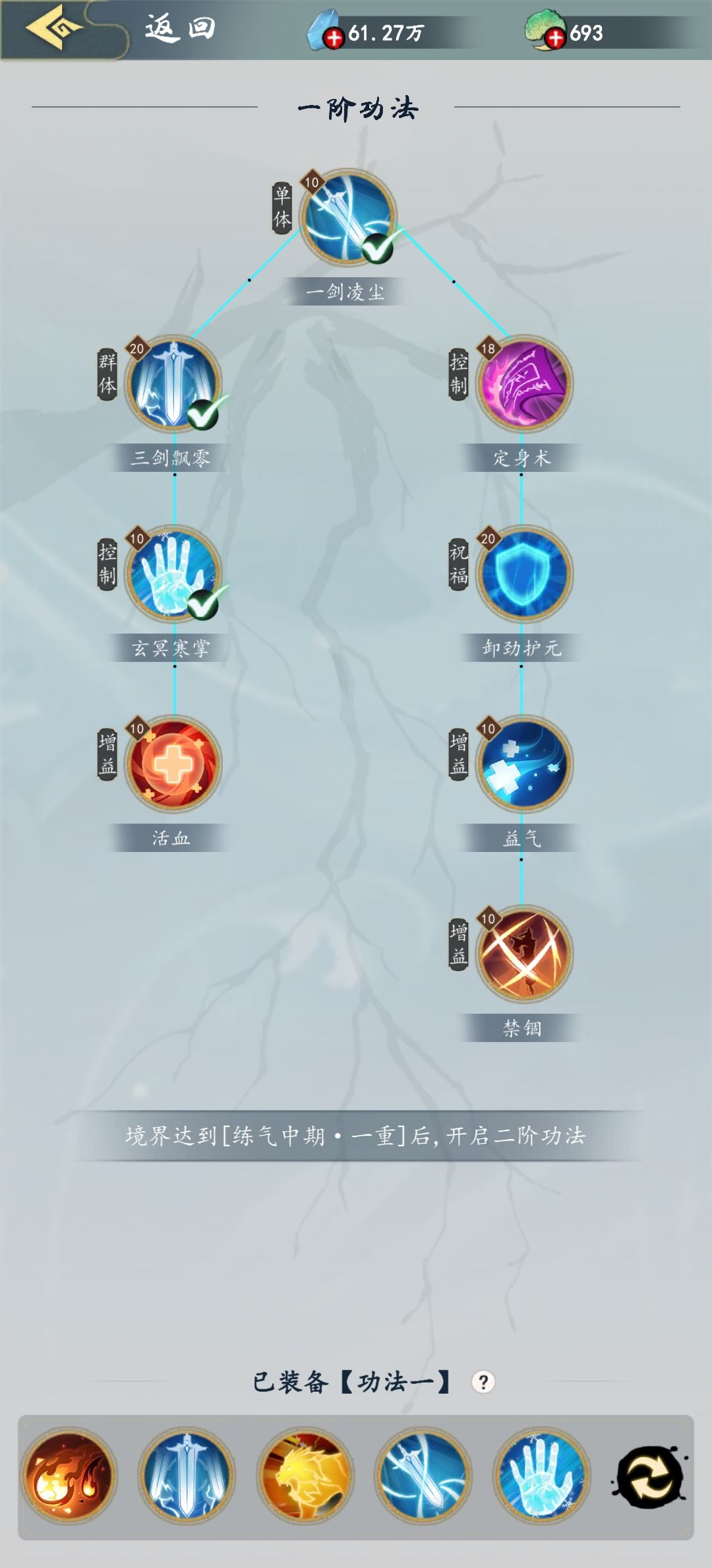 1.前期练气能打到80多层,先升定身技能,赌眩晕,然后加盾,这时候强化武器的真气就能派上用场了,前期只强化单个装备。 2.功法总纲,先用来升定身在升盾,群攻技能第三个升,一阶群攻倍率低,升级效益低。 3.具体的一套技能如图2,祝大家早日打穿!